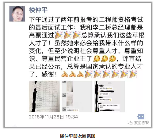 在政策的引領(lǐng)下,在樓仲平不斷突破,不斷精進(jìn)下,樓仲平順利通過(guò)了工程師評(píng)審。他也欣喜表示:“雖然這未必會(huì)給我?guī)?lái)什么樣的變化,但至少說(shuō)明社會(huì)尊重人才、尊重知識(shí)、尊重民營(yíng)企業(yè)主了,總算是國(guó)家承認(rèn)的專(zhuān)業(yè)人才了!”