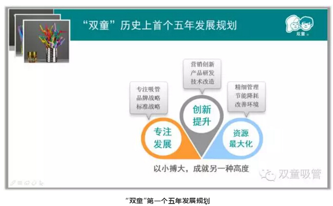 2005年,“雙童”提出了第一個(gè)五年發(fā)展規(guī)劃,其中提到了三個(gè)關(guān)鍵詞“專注發(fā)展”、“創(chuàng)新提升”、“資源最大化”,在這期間,“雙童”始終堅(jiān)持“以小博大”的理念,沒有貪大求全,急功近利,專注做好一根吸管!
