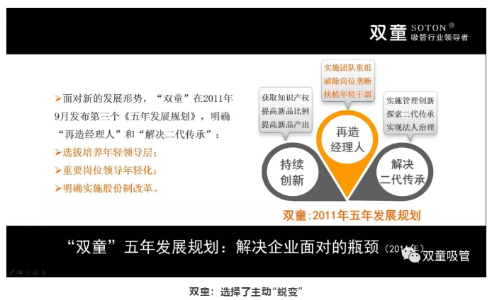 “雙童”選擇了主動(dòng)“蛻變”,并在2011年發(fā)布了第二個(gè)《企業(yè)五年發(fā)展規(guī)劃》,提出“持續(xù)創(chuàng)新,再造經(jīng)理人,解決二代傳承”3個(gè)關(guān)鍵詞。