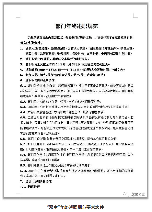 在述職報(bào)告之前,總經(jīng)辦會(huì)向各部門下達(dá)年終述職規(guī)范文件,擬定各部門述職報(bào)告的通用要求和具體要求,規(guī)定述職報(bào)告上交時(shí)間。