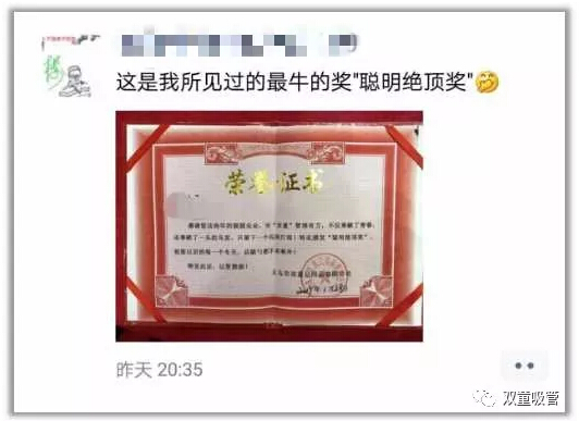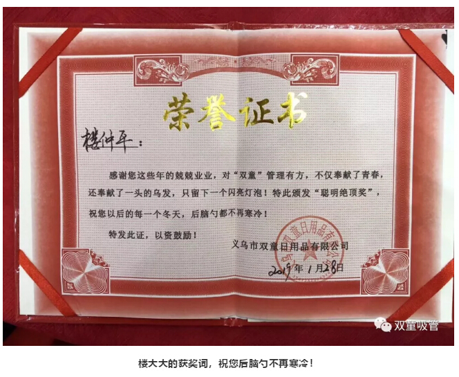榮譽(yù)證書:樓仲平,感謝您這些年的兢兢業(yè)業(yè),對“雙童”管理有方,不僅奉獻(xiàn)了青春,還奉獻(xiàn)了一頭的烏發(fā),只留下一個(gè)閃亮的燈泡!特此頒發(fā)“聰明絕頂獎(jiǎng)”,祝您以后的每一個(gè)冬天,后腦勺不再寒冷!