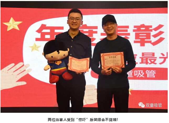 在“雙童”年會(huì)現(xiàn)場,吸管妞給“雙童”當(dāng)家人樓仲平和二當(dāng)家李二橋頒發(fā)了史上最大膽的獎(jiǎng)項(xiàng)?。ㄊ孪葲]有透露哦)