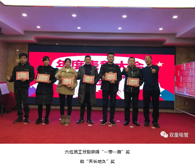 另外,我們還分別給六位員工頒發(fā)了特別的獎(jiǎng)項(xiàng):“一帶一路”獎(jiǎng)和“天長地久”獎(jiǎng)。