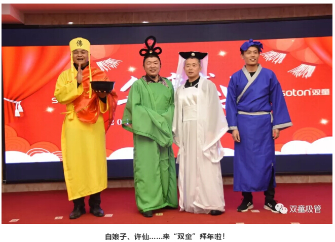 “雙童”年會(huì)的高潮節(jié)目來了!負(fù)責(zé)生產(chǎn)的副總經(jīng)理李秀前攜三大車間主任化身《白蛇傳》經(jīng)典人物前來拜年了,白娘子撒嬌、小青選白蛇王子、合唱《千年等一回》…… 逗得現(xiàn)場觀眾們捧腹大笑!