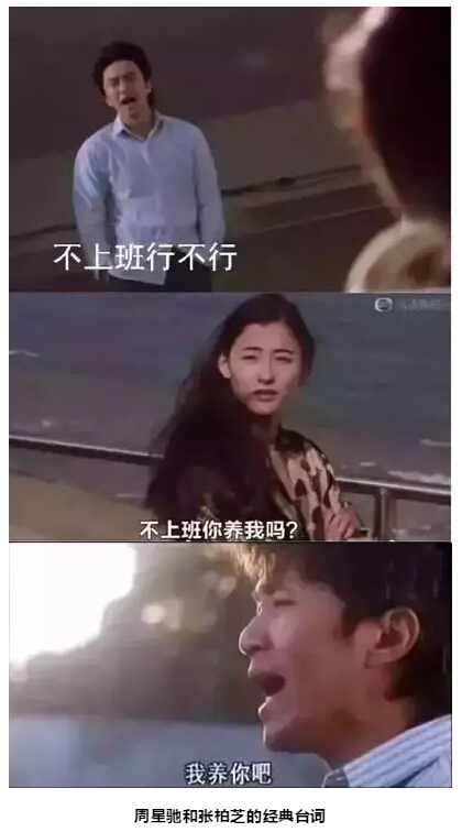 “不上班行不行?。?/span>”“不上班你養(yǎng)我嗎?”“我養(yǎng)你??!”這不是周星馳和張柏芝在《喜劇之王》的經(jīng)典臺詞嘛!