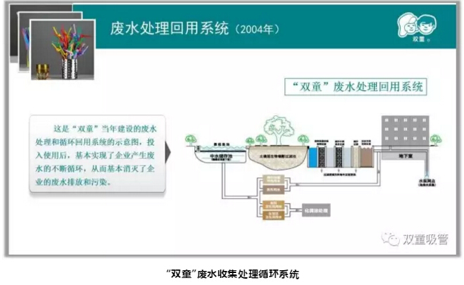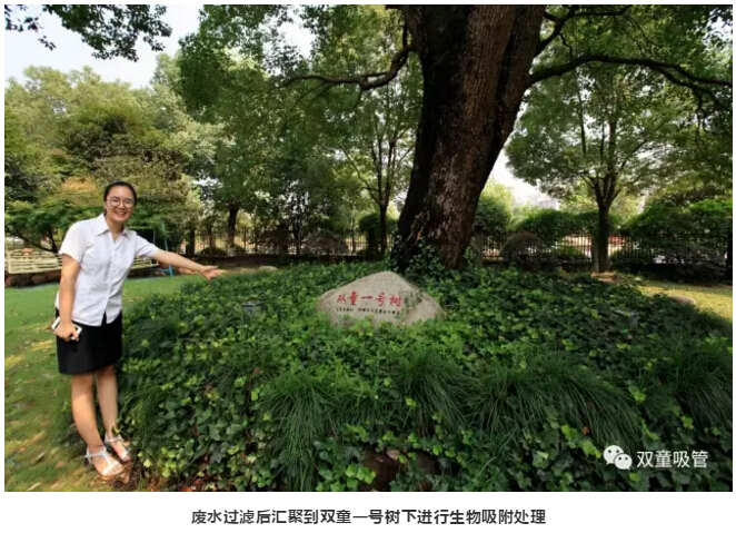 “雙童”廢水收集處理循環(huán)系統(tǒng),就是將員工用的生活廢水過濾到“ 雙童一號(hào)樹”下進(jìn)行生物吸附處理,流入中水儲(chǔ)存池,并為廠區(qū)所有衛(wèi)生間的馬桶沖水、綠化噴淋和道路清洗、車輛清洗所用,使公司的員工生活用水量節(jié)省了65%,每年為公司節(jié)省水費(fèi)支出40多萬(wàn)元!