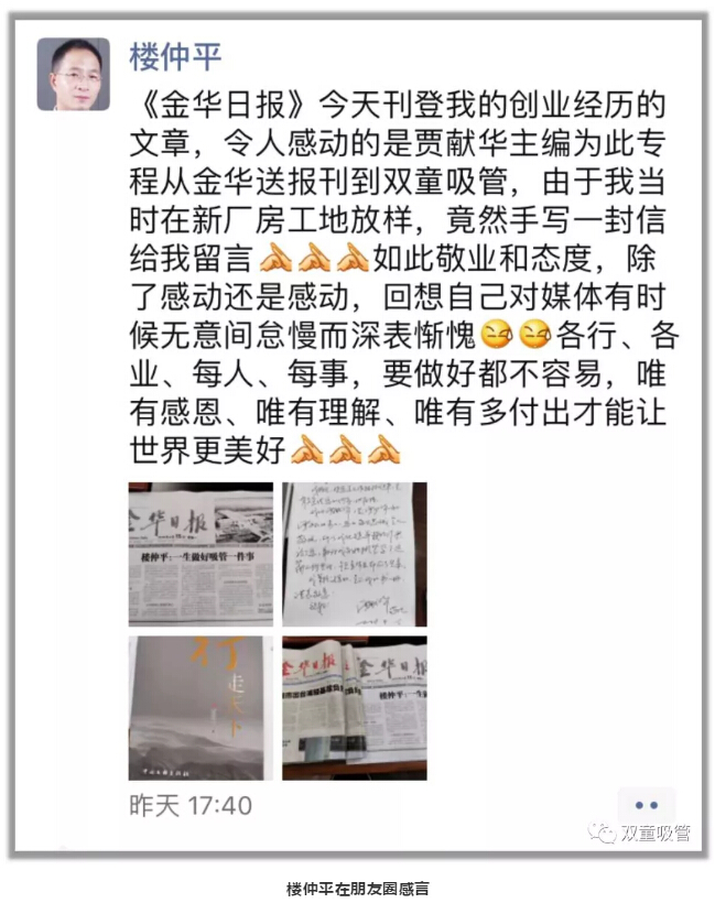 近日,《金華日?qǐng)?bào)》刊登了一篇《樓仲平:一生做好一件事》的文章,專題報(bào)道樓仲平的創(chuàng)業(yè)經(jīng)歷。值得一提的是,在文章刊登后,《金華日?qǐng)?bào)》賈獻(xiàn)華主編專程從金華送報(bào)刊到雙童吸管,其敬業(yè)的態(tài)度讓人欽佩!快來看看采訪正文吧!