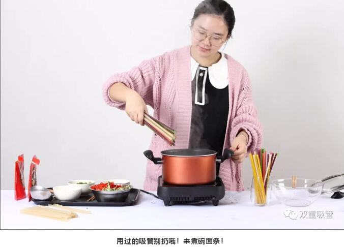 看!吸管妞和吸管妹妹正在把用過的吸管煮成面條呢!