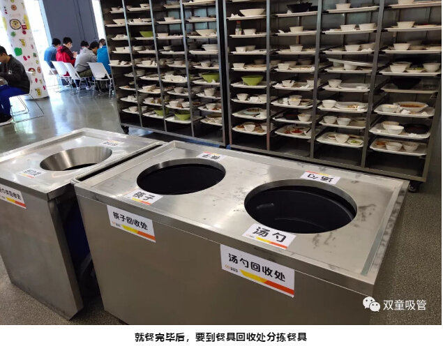 就餐結(jié)束后,我們跟著阿里員工來(lái)到餐具回收處,將紙巾、飲料瓶、筷子、湯勺等進(jìn)行分揀,放入傳送帶中方可離開(kāi),不用洗碗的人生真是太幸福啦!
