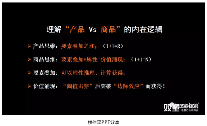 樓仲平引導(dǎo)大家思考“產(chǎn)品 Vs 商品”的關(guān)系,在這個模型中,產(chǎn)品本身(一根吸管)只是組成“商品”的基礎(chǔ)核心,產(chǎn)品只是企業(yè)的一個載體,是最基本的成本相加,1+1=2。