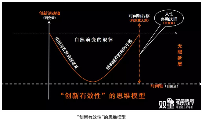 經(jīng)過前兩個“思維模型”的鋪墊,最后,樓仲平引導(dǎo)大家認(rèn)知:昨天還是“創(chuàng)新”的東西,今天就未必還是“新”。所以,“創(chuàng)新”是有“時(shí)間軸”的,隨著“時(shí)間軸”不斷后移,原有的“創(chuàng)新”有效變成了無效,創(chuàng)新活動也就“無窮無盡”!