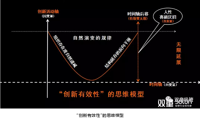 再通過進(jìn)一步的推導(dǎo),可以得出一個創(chuàng)新思維模型:組織作為萬物當(dāng)中的組成部分,在自然演變的過程當(dāng)中組織存在“自然遞減”。為了保證組織持續(xù)存在,就需要不斷地調(diào)整和干預(yù),從而延緩組織存在度發(fā)生“自然遞減”的墮變現(xiàn)象,保持組織活力!