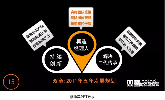 對于傳承問題,在2011年,“雙童”明確了子女不走接班權(quán),而是要讓核心員工持股,將所有權(quán)和經(jīng)營權(quán)分離。而在2018年的12月19日,在“雙童”第一期股權(quán)激勵啟動大會上,“雙童”首批12位核心員工正式簽約成為“雙童”的經(jīng)營伙伴,我們以股份合伙、業(yè)務(wù)合伙等“合伙激勵”的 方式讓優(yōu)秀人才變?yōu)楹匣锶耍寙T工和組織的目標(biāo)長遠(yuǎn)契合、共同生長、共享價值創(chuàng)造的有效延伸!
