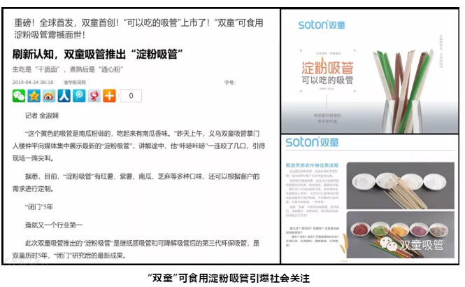 今年4月,歷經(jīng)三年潛心研發(fā),“雙童”可食用淀粉吸管震撼面世,突破了上述局限和問題的同時(shí),還對(duì)環(huán)境十分友好,完全無污染!