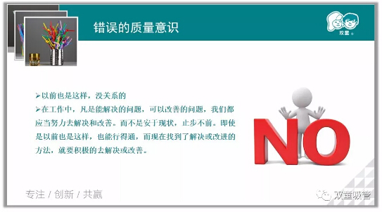 最重要的,就是樹立正確的質(zhì)量意識。在工作中,凡是能解決的問題,可以改善的問題,我們都應(yīng)當(dāng)努力去解決和改善,而不是安于現(xiàn)狀,止步不前。即使是以前也這樣能行得通,但現(xiàn)在找到了解決或改進的方法,就要積極的去解決或改善。