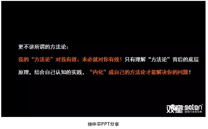 所謂的方法論,如果遵循案例去理解的話并不難,但是案例的呈現(xiàn)實際上已經(jīng)告訴你答案了。在這個過程中,大多數(shù)人之所以在獲取了許多的方法論之后,創(chuàng)業(yè)還會有許多的迷茫,是因為:我的方法論是我的,對我有效,但是未必對你也有效!
