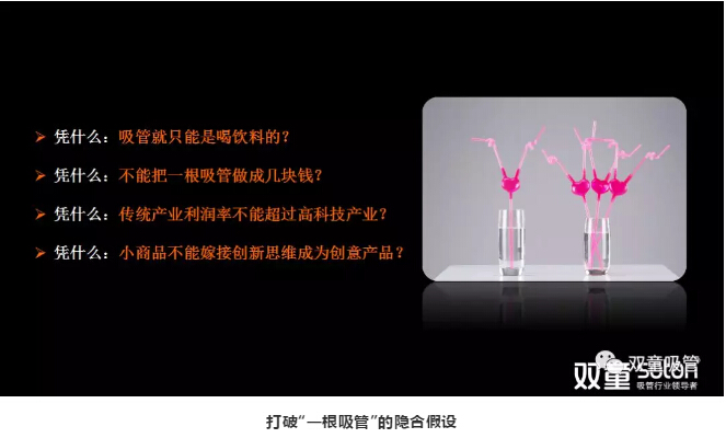 答:在生活中,許多人都容易陷入自身的“隱含假設”中,認為吸管這類產(chǎn)品就是“低、小、散、弱”,但“雙童”卻在2005年提出:吸管不僅僅是用來喝飲料的,這一個認知就打破了“吸管只是用來喝飲料”這個“隱含假設”。