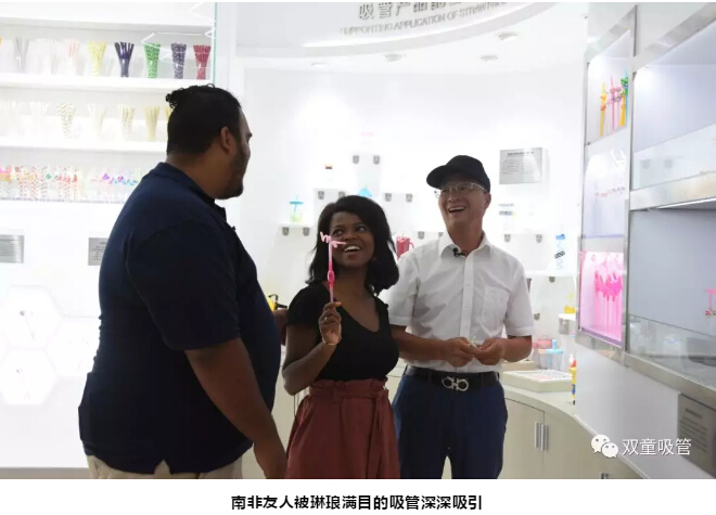接著,南非友人被“雙童”可降解吸管吸引住了,在聽(tīng)了樓仲平對(duì)“雙童”P(pán)LA生物質(zhì)可降解吸管、“雙童”紙質(zhì)吸管等一番介紹后,他們覺(jué)得十分不可思議,一根吸管不僅可以玩出這么多花樣,還可以做得如此環(huán)保!