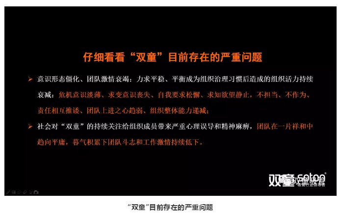 緊接著,樓仲平帶領(lǐng)大家進(jìn)入第二章節(jié),引導(dǎo)大家捫心自問:“雙童”的問題在哪里?從而讓組織在‘死’前尋求延續(xù)生存機(jī)會(huì)!