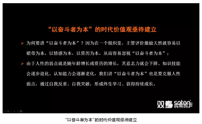 為什么要以“奮斗者為本”?由于人性的弱點(diǎn)就是隨年齡增長(zhǎng)或資歷的增長(zhǎng),其意志力就會(huì)下降、知識(shí)技能會(huì)逐步退化、認(rèn)知能力會(huì)逐漸老化,我們講“以奮斗者為本”也是要克服人性弱點(diǎn),通過自我反省、自我突破,形成終生學(xué)習(xí)、獲得持續(xù)成長(zhǎng)!