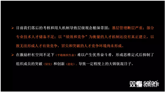 “雙童”原來落后的考核制度已經(jīng)形成了慣性,從而導(dǎo)致我們落后的考核和用人機(jī)制,導(dǎo)致基層管理斷層,部分專業(yè)技術(shù)人員儲(chǔ)備不足,以績(jī)效和競(jìng)爭(zhēng)為衡量人才機(jī)制的這樣一種模式還沒有真正建立,以至無法形成人才有效競(jìng)爭(zhēng)。