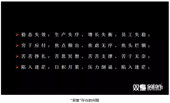 由于社會環(huán)境的復雜性、時代的巨變性和企業(yè)的自然墮變性,當家人樓仲平意識到“雙童” 直面“生死劫”!隨即通過“向死而生”的命題假設,讓團隊認知到雙童離“死亡”只有六個月,以此激發(fā)員工的危機感,從而讓“雙童”管理層再次脫離“舒適區(qū)”,遠離“危險區(qū)”,進入“恐慌區(qū)”!通過對“死”的反悟,激發(fā)組織活力,從而得以延續(xù)獲得“生”的能力。