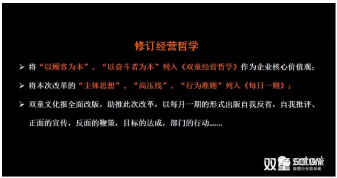 將“以顧客為本”、“以奮斗者為本”、“管理者以一線員工為本”列入《雙童經(jīng)營哲學》作為企業(yè)核心價值觀; 將本次改革的“主體思想”、“高壓線”、“行為準則”列入《每日一則》; 雙童文化報全面改版,助推此次改革,以每月一期的形式出版自我反省,自我批評、正面的宣傳,反面的鞭策,目標的達成,部門的行動…….
