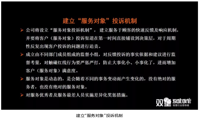 公司將設立“服務對象投訴機制”, 建立服務于顧客的快速反饋及響應機制,并要將客戶(服務對象)投訴渠道在第一時間直接鋪設到?jīng)Q策層,對于周期性反復出現(xiàn)客戶投訴的問題進行追責。 成立由不同部門成員組成的監(jiān)督小組,對反饋投訴的事實依據(jù)和建議進行監(jiān)督考量,對觸碰紅線行為要嚴懲嚴打,防止大事化小、小事化了,進而增加客戶(服務對象)滿意度。 服務對象是動態(tài)的,是會隨著不同的事務變動而產(chǎn)生變化的,沒有絕對的服務者,也沒有絕對的服務對象。對服務優(yōu)秀者及服務最差人員實施差異化獎懲措施。