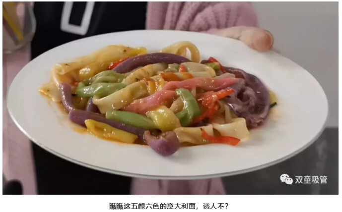 南瓜味、菠菜味、紫薯味、經(jīng)典的淀粉原味…… 各種味道的“雙童”可食用淀粉吸管拌在一起,加入鮮美的意大利醬料,又香又入味,十分美味!