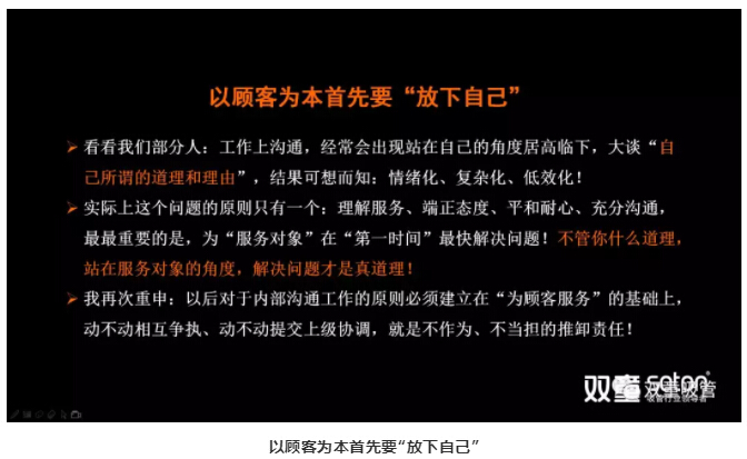 所以,管理者們不要把自己當(dāng)成高高在上的領(lǐng)導(dǎo),而是把自己當(dāng)成一線(xiàn)員工的服務(wù)者,管理者。唯有建立“為下屬服務(wù)、為對(duì)象服務(wù)、引導(dǎo)團(tuán)隊(duì)共同成長(zhǎng)”的意識(shí)才能真正實(shí)現(xiàn)為顧客服務(wù)。以顧客為本首先要“放下自己,為“服務(wù)對(duì)象”在“第一時(shí)間”最快為員工解決問(wèn)題!
