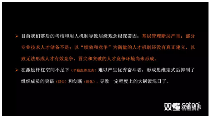 緊接著,樓仲平開(kāi)始解惑:“‘雙童’“家文化”是建立在員工和企業(yè)共同創(chuàng)造的基礎(chǔ)之上,是所有員工以創(chuàng)造價(jià)值獲得生存為最高追求的平臺(tái),而不是休閑和養(yǎng)老的地方。此次改革之所以建立“以?shī)^斗者為本”,就是為了以激發(fā)大家的積極性,創(chuàng)造更高的價(jià)值,從而讓你們拿到更高的工資,從而讓管理者拿到更高的工資,從而讓企業(yè)獲得更好的發(fā)展!”