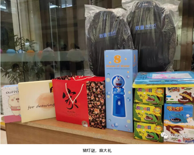 活動(dòng)正式開(kāi)始!員工們?cè)缇蛙S躍欲試?yán)?!大家紛紛?lái)到燈籠旁仔細(xì)閱讀燈籠下掛著的燈謎,得出答案后到領(lǐng)獎(jiǎng)區(qū)校對(duì)答案,猜對(duì)燈謎的員工們即可獲得抽獎(jiǎng)機(jī)會(huì)一次,禮盒月餅、“雙童”定制背包、桌面飲水機(jī)……各類禮品也讓員工們喜笑顏開(kāi)!