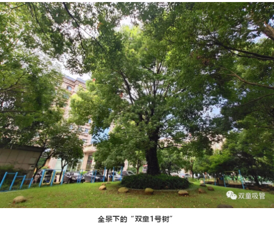 現(xiàn)在的“雙童1號樹”已經(jīng)是郁郁蔥蔥的一片啦,普通的手機相機根本容不下它了!在全景模式的拍攝下,終于把這位“大巨人”給收下啦!怎么樣,拍的效果還不錯吧?