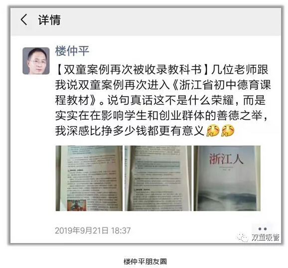 號外!號外!“雙童”案例再次被收錄教科書!近日,幾位老師告訴當(dāng)家人樓仲平,“雙童”案例出現(xiàn)在浙江省初中德育課程教材《浙江人》當(dāng)中,樓仲平也第一時間在朋友圈中分享了這個好消息,并感言:這比掙多少錢都有意義!