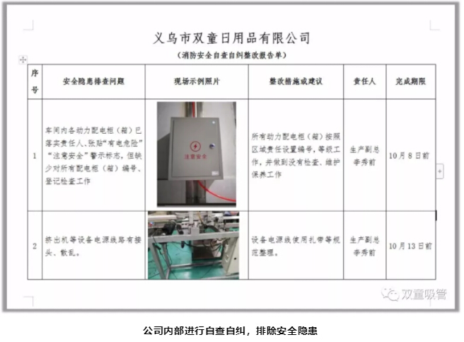 此次重大火災(zāi)事故發(fā)生后,瞬間引發(fā)了“雙童”強(qiáng)烈危機(jī)感,所有“雙童”人深刻意識(shí)到安全的重要性!安全工作已經(jīng)迫在眉睫,雖然事故發(fā)生后恰逢國(guó)慶員工放假期間,“雙童”安全工作也在緊鑼密鼓的開(kāi)展,廠區(qū)內(nèi)安排了值班人員,每天開(kāi)展安全排查等工作,進(jìn)行自查自糾,并邀請(qǐng)專家到公司做安全指導(dǎo)工作?!半p童”在安全排查期間,共計(jì)發(fā)現(xiàn)了39項(xiàng)安全隱患,明確責(zé)任人和改進(jìn)期限,杜絕安全隱患!