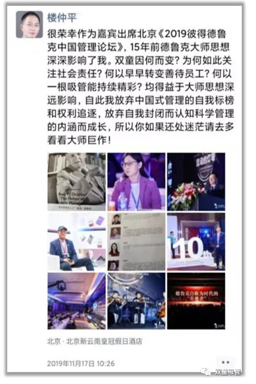 11月17日,“雙童”樓仲平作為受邀嘉賓出席了彼得·德魯克中國(guó)管理論壇。在論壇結(jié)束后,樓仲平在朋友圈發(fā)出了這樣的感嘆: