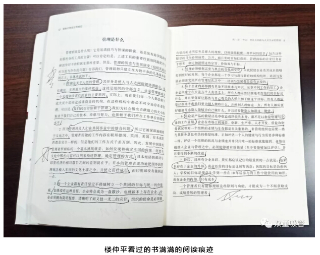 其實(shí),樓仲平早在很多年前,就已經(jīng)開(kāi)始閱讀現(xiàn)代管理學(xué)之父德魯克的書(shū)籍,他的書(shū)架上擺滿了德魯克的管理學(xué)著作。這些書(shū)籍經(jīng)過(guò)他反復(fù)閱讀,已經(jīng)畫(huà)滿了圈圈點(diǎn)點(diǎn)的筆記。