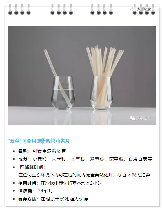 首先給大家介紹的是它的材質(zhì),“雙童”可食用淀粉吸管采用小麥、大米、玉米、木薯、土豆等天然農(nóng)作物淀粉,經(jīng)高溫、高壓、熟化、擠出、烘干精制而成!