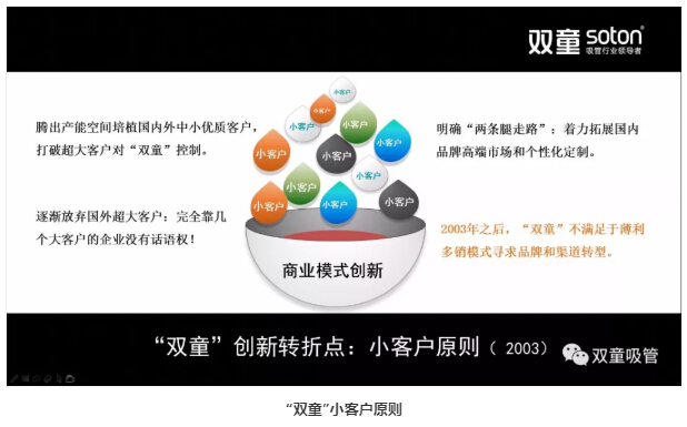 在當(dāng)時(shí)的局勢(shì)下,別的企業(yè)都忙著擴(kuò)大生產(chǎn)規(guī)模做加法時(shí),“雙童”卻反其道而行之,做減法,在2003年提出了“兩條腿走路”和“小客戶原則”,在原有規(guī)模下改變商業(yè)模式,寧可盈利不做大,不要做大不盈利。