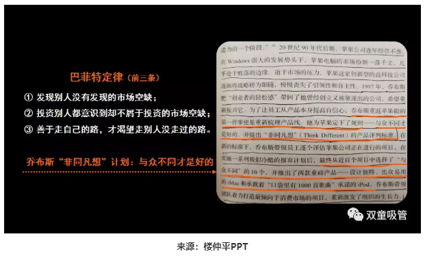 以巴菲特定律的前三條與喬布斯的“非同凡想”計(jì)劃為例,“雙童”樓仲平引導(dǎo)在座企業(yè)主們認(rèn)知:與眾不同才是好的!