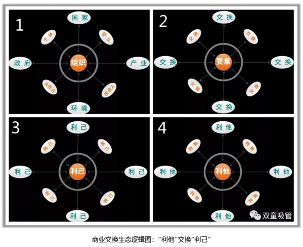 正如下圖的思維模型中所展示:組織在發(fā)展過(guò)程中,會(huì)與環(huán)境、產(chǎn)業(yè)、政府、國(guó)家等宏觀社會(huì)產(chǎn)生鏈接,而人與他人(天下萬(wàn)物)之間也存在彼此交換的過(guò)程,你對(duì)員工、社會(huì)、環(huán)境、資源的態(tài)度,換取了“他人”對(duì)你的態(tài)度,這本質(zhì)上雙方出于“利己”的目的,但同時(shí)又給對(duì)方創(chuàng)造了價(jià)值,讓雙方都有所獲得,從而最終實(shí)現(xiàn)了“利他”。