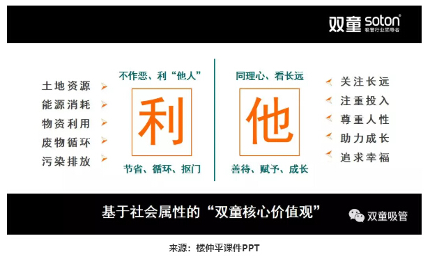 以“雙童”為例:“雙童”樓仲平一直以來(lái)深受日本文化的影響,因此,經(jīng)營(yíng)“雙童”26年的過(guò)程中,不斷的轉(zhuǎn)變,不斷的放棄,不愿做一家只能掙錢的大公司,而希望做一家有利于行業(yè)、有利于社會(huì)、有利于環(huán)境生態(tài)的好公司。
