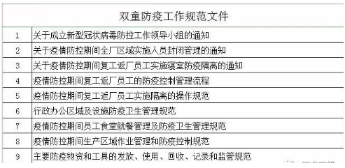 緊接著,“雙童”起草出臺(tái)了一系列有關(guān)防疫工作的流程規(guī)范文件,擬定了各項(xiàng)企業(yè)疫情防控流程,從而形成所有返廠員工的行為準(zhǔn)則,做好復(fù)工前的防疫工作部署!