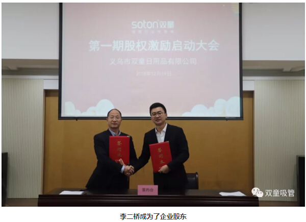 2001年9月,李二橋經(jīng)哥哥介紹成為了“雙童”的一名“理管工”。他從理管工開始努力,厚積薄發(fā),先后任職車間統(tǒng)計員、車間班組長、品管部主任、總經(jīng)理助理、總經(jīng)理等崗位。2018年12月,他在股權(quán)激勵大會上接過了股權(quán)激勵證書,晉升為公司股東,完成了從打工仔到“義烏勵志哥”的完美蛻變!
