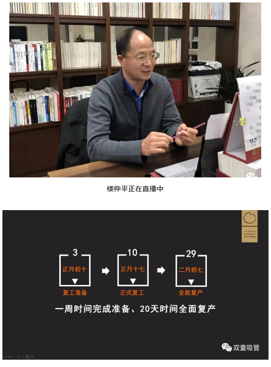 近日,“雙童”樓仲平受邀在混沌大學(xué)APP和混沌領(lǐng)教任煜、王民盛、趙若宇等老師,圍繞逆戰(zhàn)之突圍篇——制造業(yè)如何應(yīng)對挑戰(zhàn)主題進(jìn)行分享互動。樓仲平也借此機(jī)會線上分享了“雙童”的復(fù)工反思錄,引起數(shù)萬人觀看。