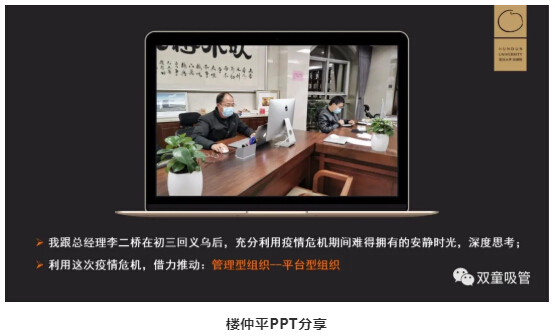 利用此次疫情危機(jī),雙童樓仲平及李二橋充分利用“難得的安靜時光”,充分思考并完善組織變革,讓組織成員在此次危機(jī)的影響下得以完全轉(zhuǎn)變,推動雙童從“管理型組織--平臺型組織”轉(zhuǎn)變,盡最大努力將危險化解為機(jī)遇!