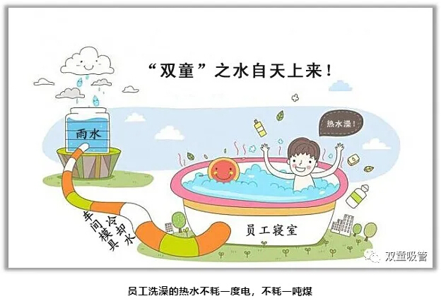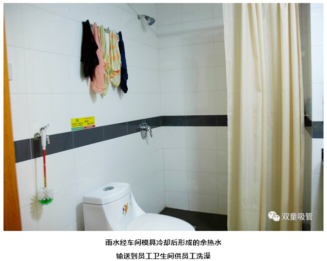 這些雨水在經(jīng)過過濾后就可以作為消防用水、車間模具冷卻用水!最神奇的是,“雙童”員工洗澡的熱水不耗一度電,不耗一噸煤,全部是收集好的雨水經(jīng)車間模具冷卻后形成的余熱水哦!