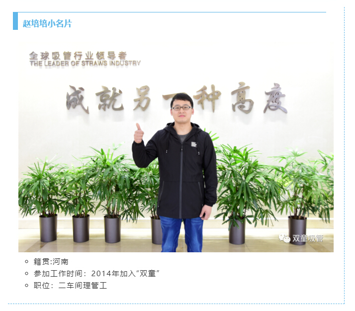 2014年,趙培培加入“雙童” ,在二車間做理管工作。“到現(xiàn)在已經(jīng)整整六年了,這六年感覺自己還是成長了許多的!”趙培培笑著說道。