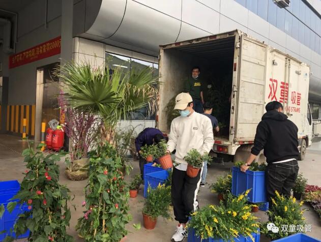 就在前兩天,“雙童”樓仲平采購(gòu)的一大批花卉到啦! “雙童”的男同胞們都化身大力士,將一棵棵花卉搬上了屋頂按位置擺放。
