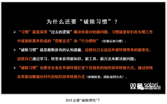 為什么要破除慣性呢?因為習(xí)慣就是采用“過去的邏輯”解決你面對的新問題,是大家在長期工作中逐漸積累并形成的“思維定式”和“行為慣性”。
